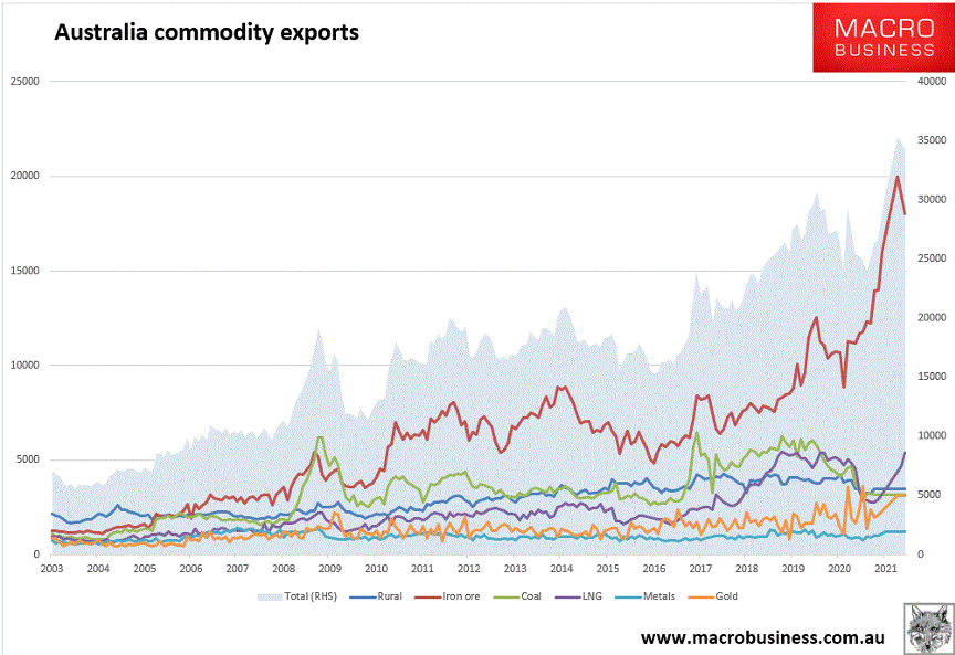 At any rate, with trade tensions pushing commodity prices higher, Australia is on the grateful end of another commodity boom, with iron ore prices in particular through the roof.