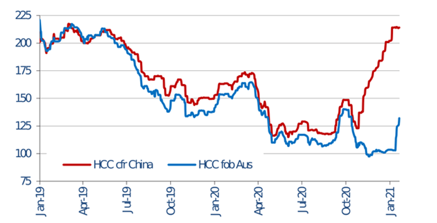 This is the coal price. But you can see there’s two separate prices. The blue line is Australian free-on-board price (before it leaves Australia). And the red line is the Chinese delivered sea-borne – the price it is by the time it lands in China.